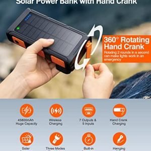 High Capacity Portable Charger: With 45800mAh high-capacity premium polymer battery, this solar power bank provides multiple times of charges to your devices. Equipped with smart protect IC, it intelligently guarantees the charging safety. Gives you ultra-long safe charging time.