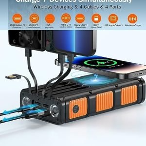 Seven Outputs & Five Inputs: With 3 built-in output cables (iOS & USB-C & Micro USB), 3 output ports ( USB*2 & USB-C*1), and a wireless charging area, this power bank supports charging 7 devices simultaneously. It is the most in the market. With 1 USB-A input cable and 2 input ports (iOS & USB-C), it offers five ways to be recharged. ALL charge methods are included, it keeps all your devices powered and getting rid of messy cables.