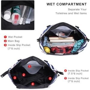 Dry Wet Separated Gym Tote with Multi Pockets: The carry luggage bag includes 3 exterior open pockets, 2 exterior zipper pocket, 1 main inner pocket, 3 inner slip pocket, 1 inner wet zipper pocket. Spacious space can easily accommodate 3-5 days of travel clothes, toiletries and wet towels;