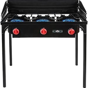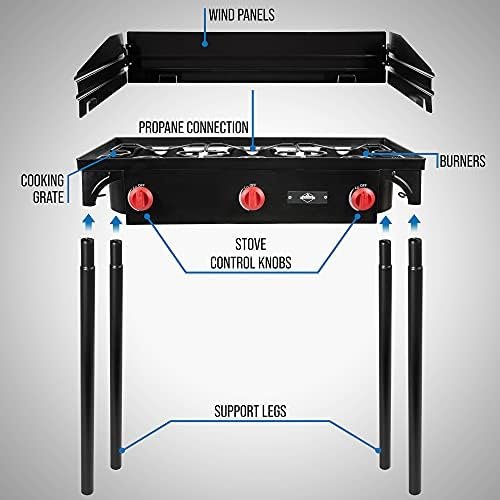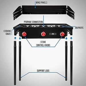 EXTRA LARGE CAST IRON COOKTOP | Spacious Three-Burner Range Delivers High Heat Output Up to 225,000 BTUs for Diverse Food Preparations | Just Attach Any Standard 20 Pound Propane Tank to Boil Water; Simmer Soups, Chilis & Stews; Fry Eggs, Sausage & Bacon; Grill Steaks & Chicken; Stir Fry Vegetables & Much More