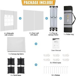 ✅【Package Includes and Service】The Package Includes:1x 10X20 pop up canopy frame, 1 x canopy top cover, 4 x Sidewalls with window, 2 x Sidewalls with zipper, 12x Ground Nails, 4 x Sandbags, 6 x Ropes, 1 x Carry Bag, 1 x Manual.If you have any questions, please contact us, we will provide satisfactory service.Please note that in order to extend the service life of the tent, please do not use it in bad weather such as strong wind and heavy rain.