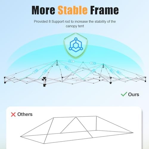 ✅【Easiest Setup & Reinforced Top Structure】Our 10X20 canopy adopts one-touch center locking technology, central hub locks out all four legs with a single push.One person can install it in a few minutes, no tools required.The top is equipped with 8 wind-blocking poles to make the tent structure more stable and wind-resistant.