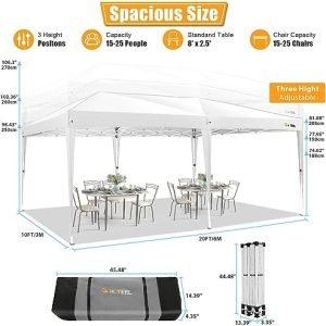 ✅【3 Adjustable Height 】You can adjust party tent in 3 different heights (98″, 102″, 106″) according to your needs with thumb button to provide enough headspace. Upgraded thumb latch system is easy to lock and release, protecting fingers from pinching.Comes with a carrying bag, you can easily transport the tent wherever you want to go.