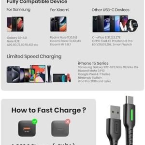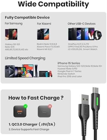 1 Use USB-C to USB-C cable for fast charging if your device’s original cable is USB-C to USB-C 2 Requires QC fast charger and a fast-charge phone. Cable alone is not fast-charge. 3 Fully Compatible with Samsung Galaxy S21 / S21 Ultra / S20 /S20 Plus /S20 Ultra /Note 20/10 Plus / Galaxy S8 / S8+ / S9 / S9+ / S10 / HTC 10 / Sony XZ / LG V20 / G5 / G6 / Xiaomi 5 4 This cable doesn’t support high-speed charging for: Google Pixel, iPad Pro 2018/2020, One Plus, or HUAWEI SuperCharge due to brands’ ‘private charging protocol’.