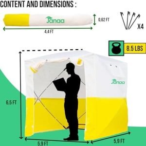 🛠️FOR PROFESSIONALS: Specially designed for intensive professional use, Janaa’s JAX3 work tent is your ultimate outdoor assistant. But that’s not all! From construction sites to outdoor events, filming, camping, and more, our tent will accompany you everywhere. Once set up, the tent measures 5.9×5.9×6,5 ft. Weight: Only 18.5lb. The work tent comes with a dedicated transport bag for easy portability. When folded, it measures only: 4.4×0.66×0.62 ft.