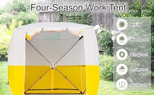 ⏱️QUICK AND EASY SETUP: The work tent unfolds in less than a minute. No hassle or excessive effort, and no screws to lose. The tent comes with an instruction manual and an assembly video that you’ll only need to watch once or twice because it’s so simple. Just push the indicated pressure points to make the tent operational. In case of strong winds, anchoring spikes are also included with the tent.
