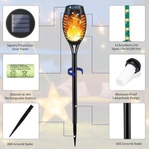 Gorgeous Flickering Flame: Solar outdoor lights flicker a gorgeous dancing flames, a safe alternative to the real “flames”. Through Upgraded 12LEDs, it casts a safe, soft and mood-enhancing glow for garden decor. These are mini torches with the total length 20.6 inches.