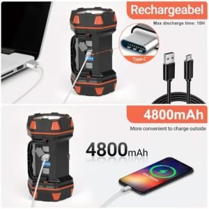 Built-in 4800mAh rechargeable battery provides long runtime, you could plug provided data line into your car’s USB port or laptop for recharging and no need to replace battery. Even better, this led lantern has a USB port out for charging your mobile or other devices, making it great as an emergency light during power outages, hurricanes, earthquakes, indoor and outdoor usage.
