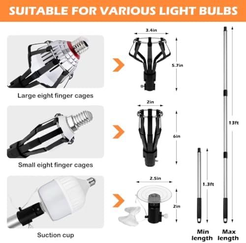 【Bulb Changer Kit】This light bulb changer for high ceilings includes large 8-finger cage *1, small 8-finger cage *1, sucker head *1, free-splice telescopic rod *10 (up to 12.9 feet). A set of light bulb changer to meet your various needs. If you have any questions about this light bulb changer, please do not hesitate to contact us.