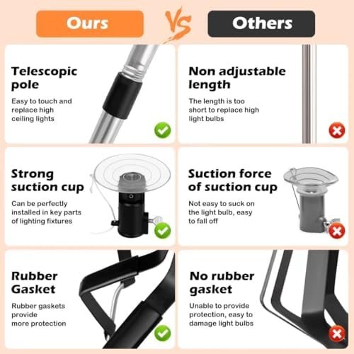 【Durable Grip Design】The light bulb changer for high ceilings is made of high quality material with non-slip lines for high touch and grip. The design of the light bulb changer makes it easier and more comfortable to change the lamp. This light bulb changer for high ceilings is a good helper for your family.