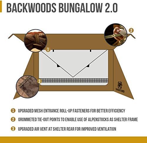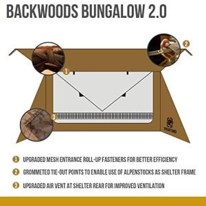 ★ 𝘽𝘼𝘾𝙆𝙒𝙊𝙊𝘿𝙎 𝘽𝙐𝙉𝙂𝘼𝙇𝙊𝙒 2.0 𝙑𝙚𝙧𝙨𝙞𝙤𝙣: Classical bakers tent that made with 75D Ripstop Nylon fabric, waterproof treated seams with 1500mm waterproof rating, reinforced groments & tie-out points, quality YKK zippers for extra durability and protection