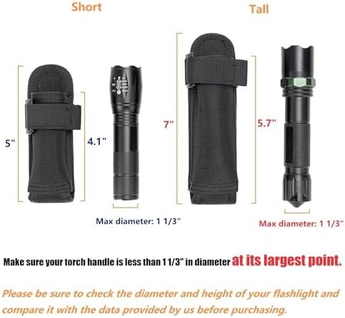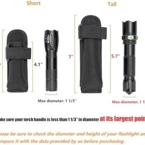 Note: Torch is NOT included. Firstly, please make sure that the diameter of your torch body is less than 1 1/3″ at its largest point. Then measure the length of your torch body and compare it to the length of our flashlight pouch. And choose one that is close in length. Height of the short one: front: 4.1″, back: 4.9″; Height of the tall one: front: 5.7″, back: 6.9″.