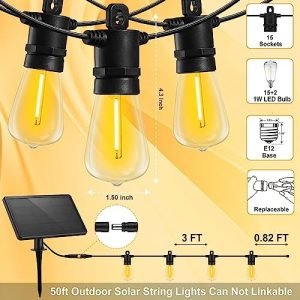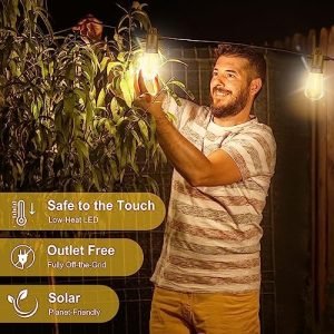 【Long Lifespan String Lights Solar Bulbs】– No matter the rainy, windy, or other damp climates, camping waterproof solar lights can work well in different weather, 25,000 hours lifespan energy-saving light bulbs, mostly reducing the maintenance costs for replacement bulbs.