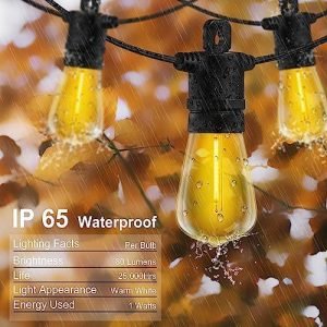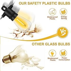 【Easy Installation】 — Patio string lights for outside are set up easily, hanging string lights can be hung by ceiling hooks, cup hooks, or zip ties. Connectable end-to-end plug design with 15 sockets, 17 plastic bulbs, and an E12 base. Each bulb with 1W, and 15W for the whole patio string lights.