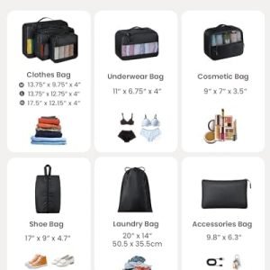 🧳 8PC Set Large Capacity: The suitcase organizer bags set includes 3 different-sized Packing Cubes(Large, medium, and small), 1 underwear bag, 1 cosmetic bag, 1 shoe bag, 1 laundry bag, and 1 accessories bag. These packing cubes for travel can easily fit into commonly used 20-inch, 24-inch, or 28-inch suitcases. It is a good travel accessories companion.
