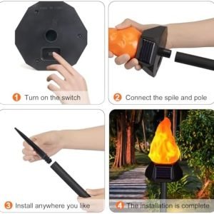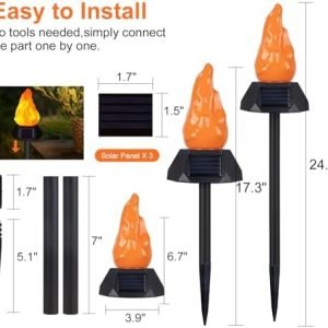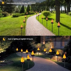 【Solar & Light Sensor Switches】Each solar outdoor lights come with three solar panels. It can light up 10-12 hours when it is fully charged. And automatic switch designed the lights will auto on/off from dusk to dawn. They’re nice solar flame lights for yard decor, solar ground lights, solar patio lights, solar yard lights, solar walkway lights, solar landscape lights, solar floor lights