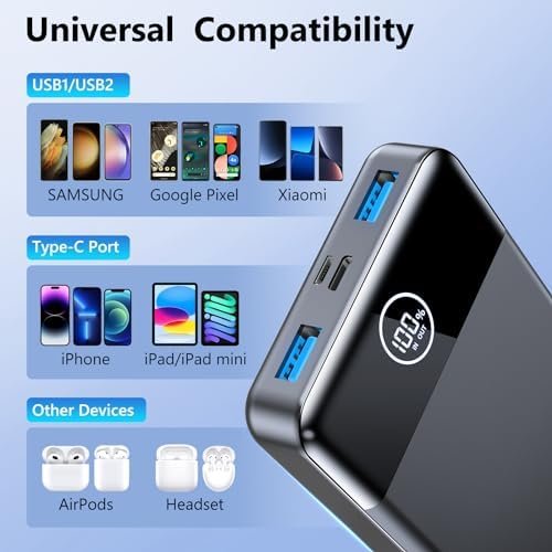 【Charge THREE at Once】The Power bank has a built-in Type-C port and two USB ports, it can juice up THREE devices simultaneously. Triple-port design allows you to share portable charger with families and friends.Our Battery Pack is compatible with most electronic devices on the market like various cell phones, headphones, tablets, etc.Best emergency battery pack for iPhone Pro15, 14, 13, 12, Samsung S23 S22 S21, S20, Airpods and more.