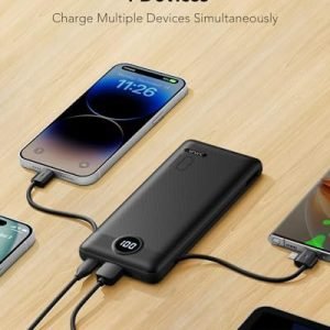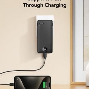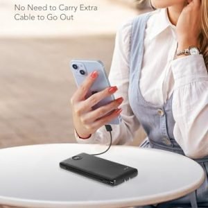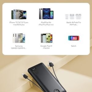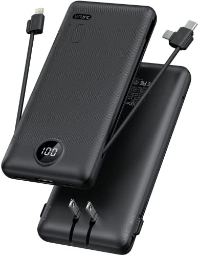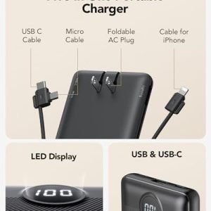 [Portable Charger With Built-in Cables & AC Wall Plug] Not only it has a built-in Micro cable, USB C cable, and other charging cable for iPhone, but also is equipped with a USB port,and USB C port. Also, Portable phone charger is built-in wall plug that charges the power bank itself directly from the wall outlet.[Slim & Compact Design] Product dimension is 5.9 x 2.8 x 0.7 in,weighing 8 Oz. Compact design is more convenient for us to carry on the go, and does not add any weight.[Smart Digital LED Display] You can know the remaining power at a glance via LED Display. Also, the 3D texture on the surface provides you with a better 3D touch and grip to prevent the power bank and phone from slipping off.[Wide Compatibility] Using the built-in charging cables to charge, the portable battery charger is compatible with iPhone, Android devices, and USB-C most mobile phones and smart devices etc. This external battery power bank can meet most of the charging needs of daily life.[PRODUCT PACKAGE] 1x Power Bank, 1x User Manual.