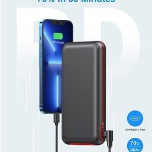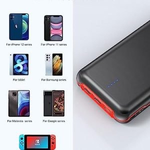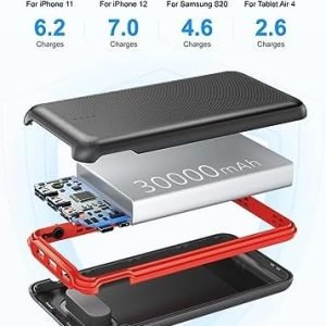 “Through the USB A1 22.5W fast-charging port, your for iPhone 12 can be fully charged in 40 minutes, and your Galaxy S9 in 50 minutes. (Fast-charging cable required)”A 30000mAh capacity power bank can charge the for iPhone 8 10 times, the for iPhone 12 7 times, the iPad Mini 4 up to 4 times, the Samsung S9 6 times, and the game switch 3 times, keeping your device ‘FULL’ all day.