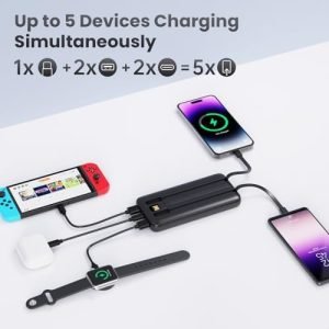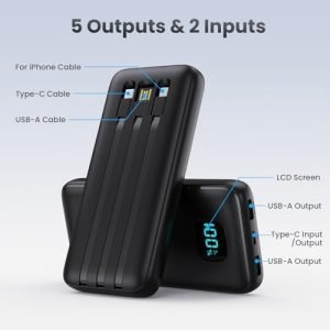 🔋【Charging 5 devices simultaneously】Universal portable phone charger: with 5 outputs (2 cables & 2*USB A port & 1*USB C port), which can charing 5 devices simultaneously,widely compatible with iPhone, iPad, Samsung, Google Pixel, LG, Motorola, HTC, OnePlus, Noval, Blackberry, Huawei, Xiaomi, Oppo, other phones and tablets… Battery pack with PD 3.0A high-speed USB-C port supports for both input and output.