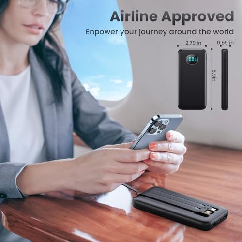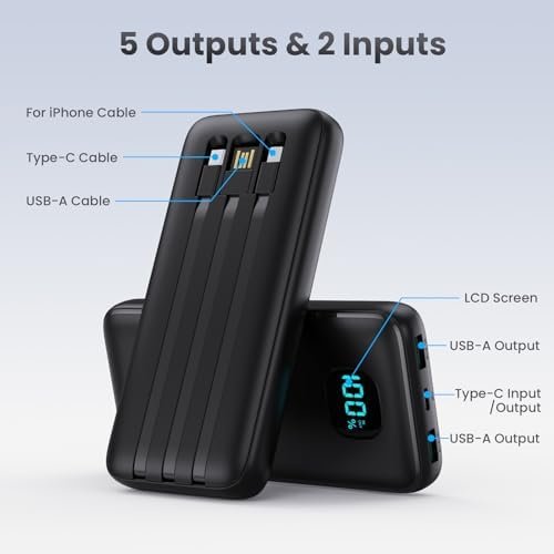 🔋【Portable Charger with Built-in 3 Cables】This portable charger with built in 2 output charging cables (USB-C cable, for iPhone cable) and 1 recharging cable; you can use these 2 cables directly charging your different types port devices, also built-in USB-A cable for recharging battery pack, no need to carry any extra cords, perfect for office and travel essentials, charging at anytime and anywhere.