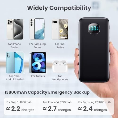 🔋【Ultra Slim & 13800mAh】This portable charger is not only ultra slim size 5.9*2.7*0.59 inch , weight 250g/8.8OZ, but also powerful capacity; Grippy design is easy to hold and incredibly portable, worry-free air flight and brings you the best experience on the go.