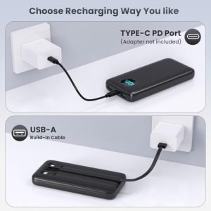 🔋【2 Ways Recharging】This portable charger with 2 inputs ( build-in USB A recharging cables & USB C port ), you can charge the power bank by plug the USB A cable to a USB outlet or USB A charger, also can recharge by connecting the charging cable through the USB C port.