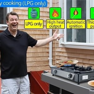 AUTOMATIC PIEZOELECTRIC LGNITION – Propane camping stove not uses lighters and matches to ignite.Automatically ignite the flame stoves.The gas burners for cooking outdoor are simpler. Portable propane stove only for LPG(Fuel not included)
