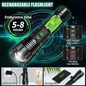 🔦【Low Battery Display】: The flashlight uses upgrading technology ensures longer usage time, which can support our flash powered led charging work for 5-8 hours. It is more durable while ensuring brightness. The high-power flashlight has a power indicator light: When the power is less than 25%, the indicator light will remain flashing red. It also indicates the charging status. Full of green, charging in red.