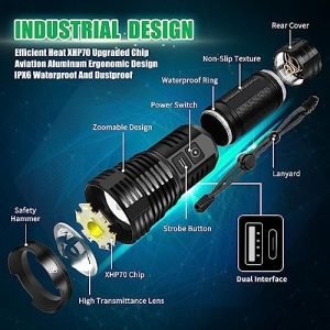 🔦【Type-C Fast Charging & Widely Uses】:Brightest Flashlight equipped with a USB-C charging cable. The fast charging port can make your flashlight fully charged in 3 hours, lasting for 24 hours! Bright flashlight can be recharged and discharged for 10000 times. Whether you’re indoors or out, on the go or on the job, ready for adventure or just to stay safe.