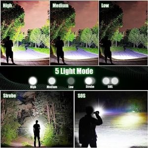 Flashlights high lumens match with 5 lighting modes: Strong light, weak light, energy-saving light, continuous flash, delayed flash, and use different lighting modes according to different situations