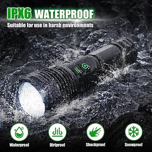 🔦【Super Bright & Large Capacity Battery】:Rechargeable flashlights are equipped with the latest upgraded led beads from This 100000 lumen flashlight uses high-quality led chips, providing brightness of up to 100000 lumens and a maximum illumination range of up to 1650 feet. Powerful Flashlight is about 10 times brighter than ordinary incandescent lamps.