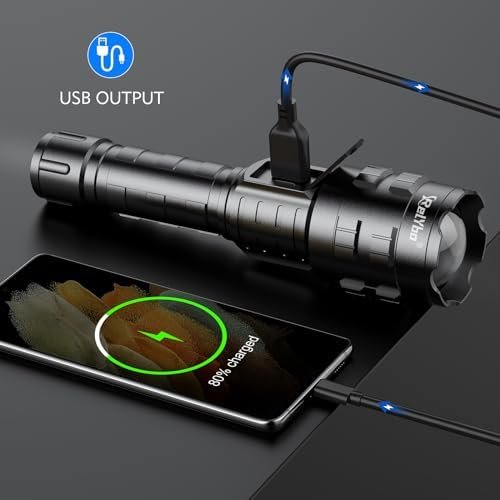 【RECHARGEABLE & POWER DISPLAY & USB OUTPUT】The LED flashlight rechargeable with type-C port, the bright torch can be charged by car charger, computer, power bank, or any USB outlet etc. The bright flashlight features power display, which is readily available the figures and clearly visible, the remaining power can be grasped at any time. Also the tactical flashlight can be used as a power bank to charge your phone in emergency as well! Super suitable for camping, hiking, dog walking.