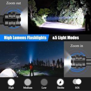 【5 MODES & ZOOMABLE】The LED flashlights high lumens feature 5 modes: high/ medium/ low/ strobe/ SOS. The strobe and SOS mode ensure that you are ready for emergencies. The low mode is excellent for searching in the dark in close quarters, reading books at night. High and medium modes are suitable for wide range lighting, such as your backyard and camping tent. In addition, stretch the head of the tactical torch to get powerful long distance spotlight or high power wide range floodlight.