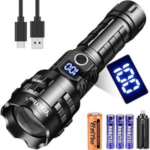 No outlet when you’re out for the day or camping or hiking on the weekend? No problem-charge your rechargeable flashlights high lumens from your laptop or power bank. When fully charged, the high powered flashlight also acts as an emergency power source outdoors, true flashlights for emergencies.Explosive breakthrough:The powerful flashlights also come with a digital power display function, allowing you to keep track of the remaining power at all times. To prevent interruptions in continuous use and enable you to replace the battery in time. And press and hold the power button for 3 seconds to quickly turn off the high powered flashlight in any mode.