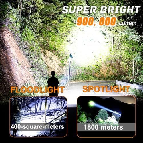 【FLASHLIGHTS HIGH LUMENS】The Relybo rechargeable flashlights equipped with XHM88 quad-core chip is capable of producing an output of 900,000 lumens, the flash light feature zoomable function, you can get the long distance beam and large range beam by stretching the powerful torch to adjust the focal length. Its high beam can easily illuminate 400 square meters of room like a giant light wall or focus on objects 1800 meters away like a long distance lightsaber.
