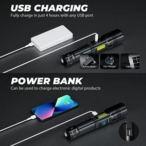 USB INPUT & OUTPUT PORTS: The brightest flashlight comes with a 5000mAh rechargeable ΒATTERY, which can work for 10 hours in low mode. The built-in USB input port makes it easy to charge the rechargeable flashlight with the included USB cable, while the USB output port allows the flashlights to be used as a backup mobile power source for your phone and other devices.