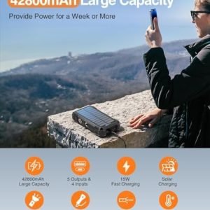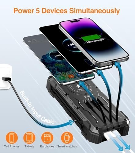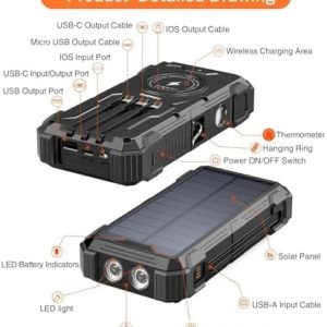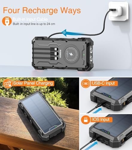 [Built-in 4 Charging Cables] This power bank comes with 3 output cables (USB-C, Lightning, and Micro USB) and 1 USB-A input cable. Whether for output or input, you won’t need to carry extra charging cables. Eliminate cable clutter and charge anytime, anywhere.[Advanced Wireless Charging] This portable charger supports advanced wireless charging, compatible with all wireless-enabled devices, such as the iPhone 15/14/13 series, Samsung Galaxy S23/S22/S21 series, and more. Simply place your device on the wireless charging area for immediate charging. Enjoy cable-free charging convenience.[Power 7 Devices at Once] This solar charger is equipped with 4 ports (Lightning input, USB-A output, USB-C input/output), providing 5V/3A high-speed charging to save time. With 4 charging cables and wireless charging, it can support charging up to 7 devices simultaneously. Keep all your devices powered. Perfect for sharing with family and friends.[Super Large Capacity] With a 42,800mAh premium Li-polymer battery, this solar power bank can charge your devices multiple times. It can be recharged via an adapter or solar power, relieving any worries about running out of power. Equipped with a smart protection IC chip, it intelligently ensures charging safety.[Sturdy&Durable Design for Outdoor] This solar battery pack is designed to be waterproof, shockproof, and dust-proof, making it ideal for harsh outdoor environments. It is equipped with dual super bright LED lights, making it a must-have tool for outdoor activities and home emergencies.[Thanks for choosing us] Every SUDROV product is certified safe and provided with a lifetime warranty. We also provide professional pre-sales and after-sales service for you. Any questions, please feel free to contact us. We promise you a satisfactory solution within 24 hours.