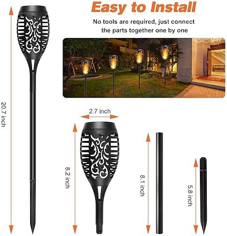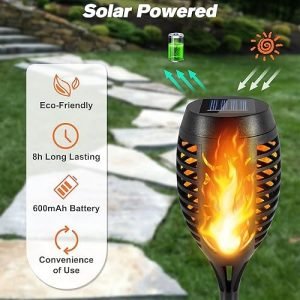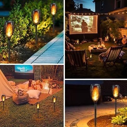 Solar Garden Lights for Outside – This solar torch light has a beautiful design and produces a stunning flame-like lighting effect, perfect for outdoor decoration such as illuminating gardens, patios, and pathways or adding ambiance to parties, holidays, and movie nights.