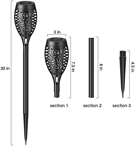 Good Durability and Weather Resistance: These solar torch lights are made out of durable ABS plastic materials that last, and the protection grade reaches IP65, so they don’t easily break down under pressure or adverse weather conditions (like rain or wind). If you want to add an enthusiastic vibe to the outdoor areas, such as back yard patio, garden, this solar torch light with the flickering flame effect would be a good choice.