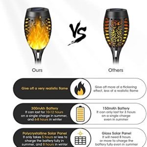 Higher-Capacity Battery & Faster Charging Speed: With a 300mAh in-built rechargeable battery, this tiki torch light can last for 10-12 hours on a single charge in summer, and 6-8 hours in winter. Other brands might give you less than 3 hours even in summer. Thanks to its high-quality polycrystalline solar panels, it only takes 5 hours or less to charge your batteries fully in summer, and 8 hours in winter. Other brands might need over 8 hours even in summer.