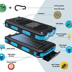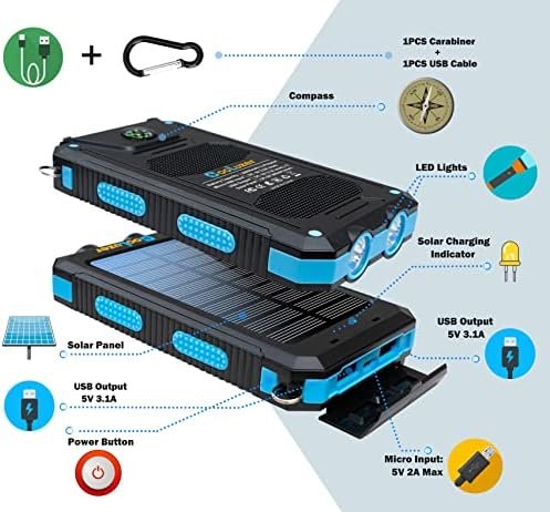 ⚡【18W fast Charging & Multi-Functions】⚡The Power Bank support QC 3.0 with two 5V 3.1A 18W fast charging Outputs,It is also a portable power bank compatible with Phones, watches, headphones and other USB devices. The solar phone charger has 2 supper bright LED lights with 3 modes (normal, strong, SOS) and has a high-precision compass, In addition, it is equipped with a carabiner for hanging the power bank charger on your backpack while climbing, walking and camping.