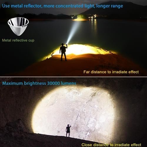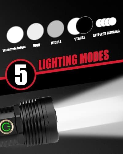 ASORT rechargeable flashlight adopts the upgraded SST40 LED chip, provides the brightest output of 80000 Lumens. And the irradiation distance up to 500M(1650FT). This rechargeable flashlight with 5 lighting modes, you can switch freely between High/Medium/Low/Strobe/Stepless Dimming,with the power display, you can see the power status at a glance. It can be continuously light up for 10 hours on low mode when fully charged.Flashlight is built with IPX6 waterproof, now you can stop worrying about unexpected weather rain or snow. Rechargeable flashlight is made of high-quality aluminum and it is sturdy enough to hit something during emergency. This suoer bright flashlight is powerful but still compact enough to fit in your backpack, survival bag, or car glove compartment. It is ideal for emergency, camping, hiking, outdoor sport.