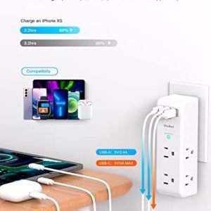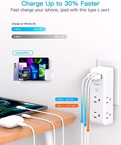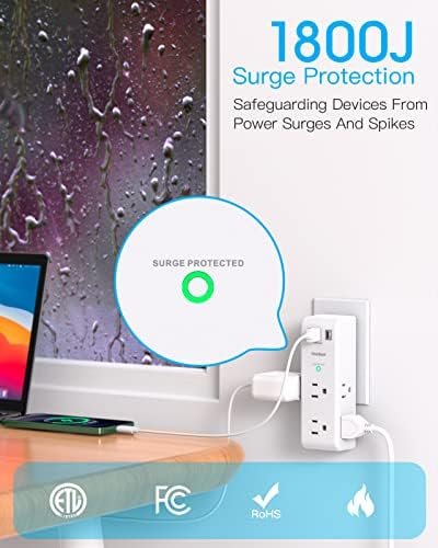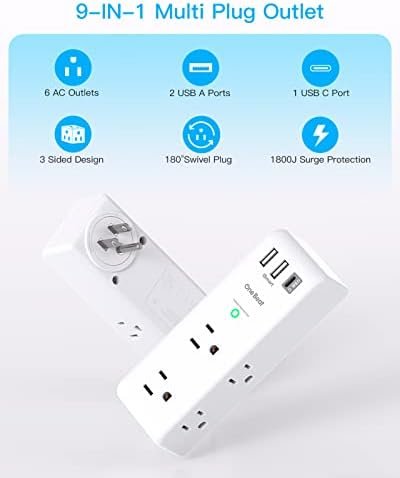 【9 IN 1 USB Wall Outlet Extender】- 6 AC outlet adapter (3 side, 15A/125V/1875W) with built-in 1800 Joules surge protector and 3 USB charging ports (1 USB C, total output DC 5V/3.1A), 180 degree rotating AC plug. The grounded indicator light that assures your devices are secure.