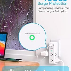 【1800J Outlet Surge Protector】- The multiple plug outlet provide surge protector electrical spikes. 3 complementary Surge Protection Circuits, TVS(transient voltage suppressor) MOV(metal oxide varistor) GDT(gas discharge tube), with response speed less than 1Ns, and minimum energy-absorbing capacity of 1800 Joules, much more quickly and reliably than the traditional MOV surge protector circuit.