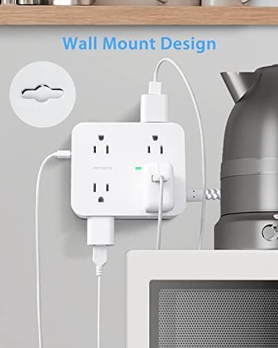 【Wall Mountable Extension Cord with Flat Plug】- The low-profile flat plug fits easily in tight spaces; and the right angle flat plug design prevents bottom plug blocking; the 5ft upgraded braided extension cord is very thick and has better current carrying capacity; the two mounting holes on back allows this power strip to be securely installed in various applications