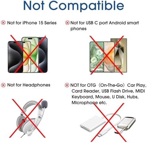 ❌Not for iPhone 15 Series, ❌Not for USB C port Android smartphones, ❌Not for Headphones, ❌NOT for OTG(On-The-Go)Car Play, Card Reader, USB Flash Drive, MIDI Keyboard, Mouse, U Disk, Hubs, Microphone etc.