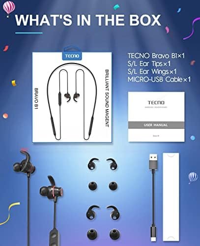 【Comfort and Secure Fit Design】: TECNO B1 Bluetooth Headphones design for delivering most comfortable wearing experience. 2 pairs of ear tips and 3 pairs of secure-fit ear hooks included in box for replacement.