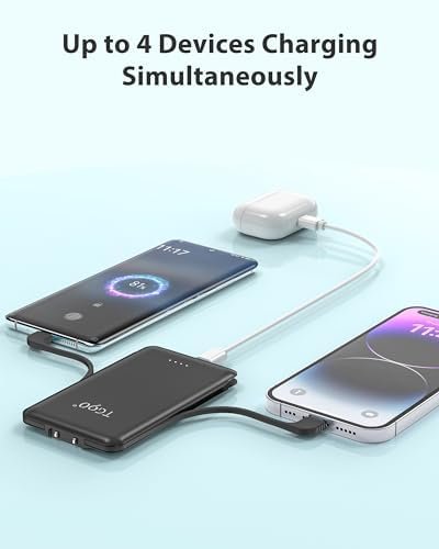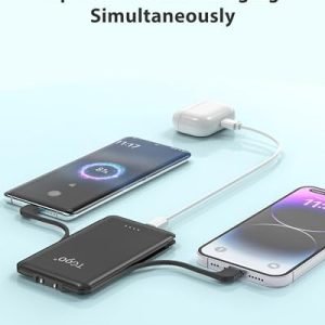 Simultaneous Charging: With 3 outputs, 2 built-in cables and an USB C in/out port, the battery pack can power your devices at the same time, greatly improving charging efficiency. Besides, multiple interface types are widely compatible with iPhone15/14/13/15Pro/14Pro/15Pro Max, etc, and most Android phones.