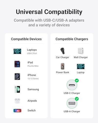 Multi-Device Charging Solution: Universal compatibility for all your charging needs with USB-A, USB-C, Fast-charging connectors and power adaptor adaptability. For example, iPhone 16/16 Plus/16 Pro/16 Pro Max/iPhone 15/15 Plus/15 Pro/15 Pro Max/iPhone 14/14 Plus/14 Pro/14 Pro Max/iPhone 13/13 Mini/13 Pro/13 Pro Max/iPhone 12/12 Mini/12 Pro/12 Pro Max/iPhone 11/SE Series; iPad Pro/Air/Mini; MacBook Pro 14″/MacBook Pro 16″/MacBook Air/MacBook Pro 13″; AirPods Series; Apple Watch Series; Galaxy S22/S22+/S22 Ultra/S21/S21+/S21 Ultra/S20/Note20; Switch, etc.